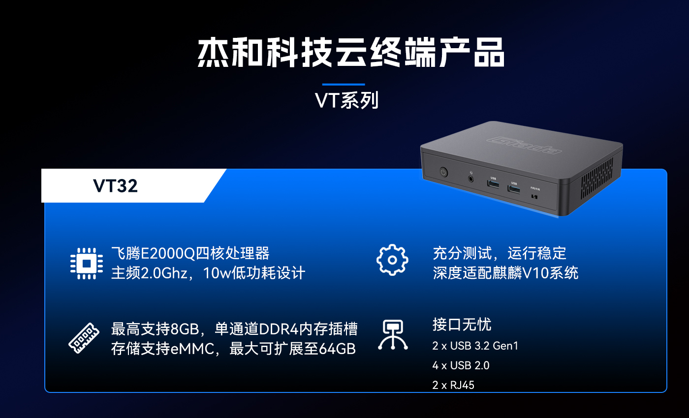 为响应信创趋势,南宫NG·28(中国)相信品牌力量科技推出了搭载国产芯片—飞腾E2000Q的云终端VT32,VT32与麒麟V10操作系统进行了深度适配,为用户打造出更加安全可信的解决方案。