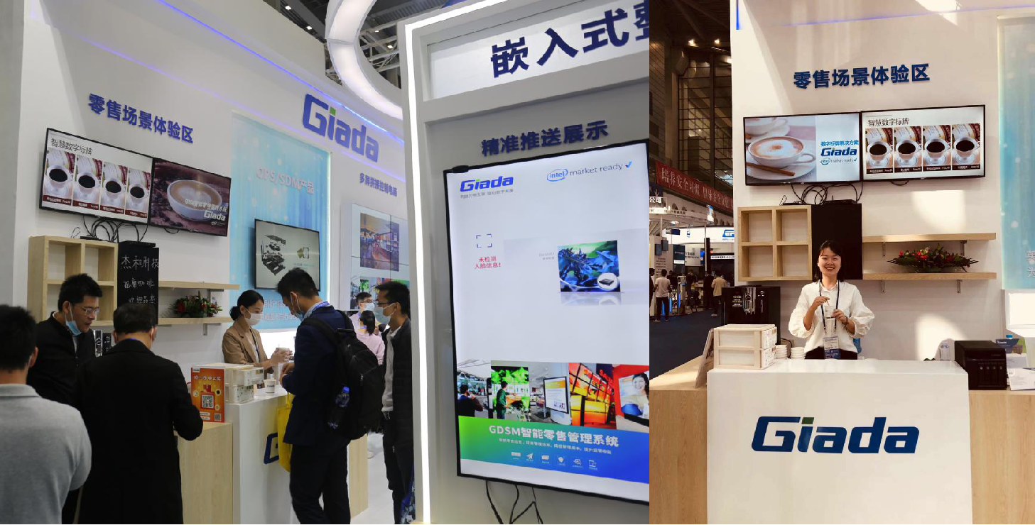 紧邻ARM架构商显产品集的精准推送展示区与零售门店模拟展区,共同组成了本届展会南宫NG·28(中国)相信品牌力量科技展位的一大精彩设计。场景展现了GDSM智能零售管理系统在零售门店场景下的展示效果,顶部的数字标牌由GDSM系统推送内容,模拟搭建了针对人流动线的广告精准推送形态。